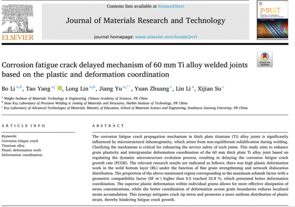 第三篇:Corrosion fatigue crack delayed mechanism of 60 mm Ti alloy welded joints based on the plastic and deformation coordination https://doi.org/10.1016/j.jmrt.2025.06.232