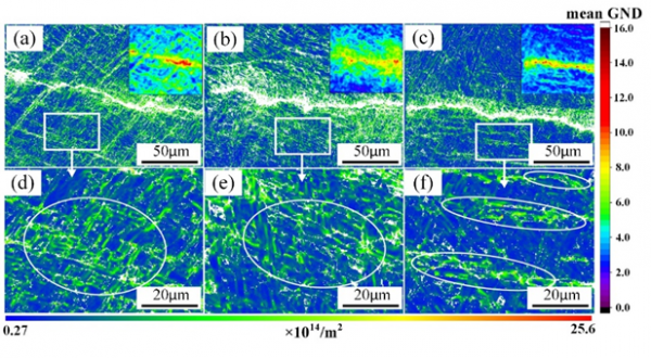 裂紋尖端GND分布,及疲勞裂紋的平均幾何位錯(cuò)密度分布:(a和d)底層,(b和e)蓋面層,(c和f)填充層。