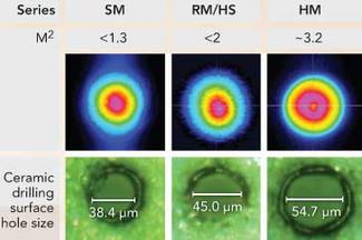 在SPI公司,我們已經(jīng)開(kāi)發(fā)了一系列脈沖激光器,可以廣泛用于標(biāo)稱(chēng)需要不同光束質(zhì)量的應(yīng)用(見(jiàn)圖2)。激光器光束質(zhì)量的影響極為顯著,主要與產(chǎn)生的聚焦斑點(diǎn)尺寸相關(guān)。對(duì)比研究則顯示出斑點(diǎn)尺寸對(duì)于標(biāo)刻和鉆孔加工應(yīng)用的影響。當(dāng)激光脈沖數(shù)量相同時(shí),單模脈沖激光器可以產(chǎn)生窄深的高深寬比的孔,而更高模式的激光器則產(chǎn)生漸寬漸淺的孔。這一結(jié)果或許在多數(shù)情況下有效,不過(guò)要指出的是,最終特征不必嚴(yán)格與估算的斑點(diǎn)尺寸一致,這應(yīng)該視應(yīng)用的要求而定。