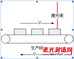 當被編碼產(chǎn)品在生產(chǎn)線上運動時,其相對振鏡掃描有一個反方向速度誤差V(如圖3所示)。該速度誤差V與生產(chǎn)線的速度相等。點陣式在線激光打碼技術(shù)通過在線監(jiān)測生產(chǎn)線的速度來得到這個速度誤差,并能夠根據(jù)這個速度誤差產(chǎn)生一個補償信號來驅(qū)動振鏡,從而抵消這個誤差。