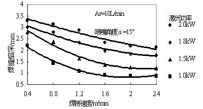 如圖3.4所示,根據(jù)激光功率的不同,分別在1.0、1.5、1.8、2.0KW四種不同激光功率下研究焊接速度對焊縫熔深的影響。