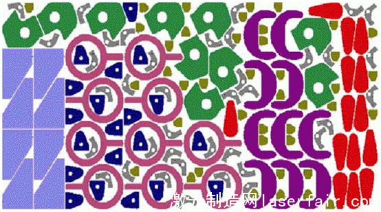 光纖激光切割非常適于高效的排樣組件的切割,典型的排樣切割如圖6所示。由于其切縫窄和較小的熱影響區(qū),工件能緊密地排列在一起,甚至是連接在一起。使用排樣法時,光纖激光系統(tǒng)相比于高精度等離子切割能節(jié)省15%的板材,使制造商從高效、節(jié)能、實(shí)用的激光加工(laser oem)系統(tǒng)中獲益。