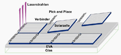 太陽能電池的組裝或疊加是通過金屬絲連接實現(xiàn)的。在這里,長而易斷的金屬絲與其他設(shè)備被固定在同一個位置。如果太陽能電池通過薄片疊壓方式來實現(xiàn)焊接,那么激光焊接過程的引入便可以省去額外的設(shè)備。