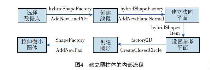 為此,本課題采用了以下辦法:(1)采用進程外應用方式[7],運用GetObject方法將CATIA作為一個對象連接與嵌入(Object Linking and Embedding, OLE),調(diào)用給VB程序應用;(2)利用VB程序的循環(huán)語句控制CATIA中的內(nèi)部函數(shù),在所有的OTP點與激光跟蹤儀數(shù)據(jù)點之間建立線段,并以線段為 中心軸,生成一個截面積很?。ū鞠到y(tǒng)中為0.01mm2)的圓柱體以等效代替光線,該步程序內(nèi)部流程見圖4;(3)利用CATIA V5電子樣機(Digital Mock-Up, DMU)模塊中的空間分析(Space Analysis)功能,選擇圓柱體與型架模型進行干涉分析,并返回檢測結(jié)果。這個功能的具體流程見圖5。