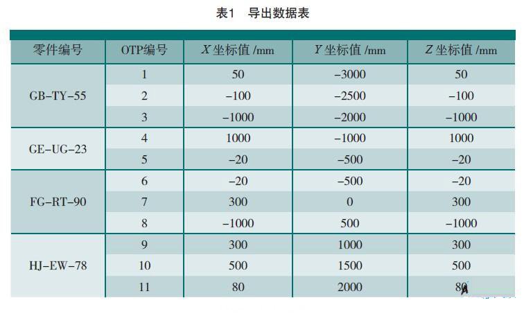 基于光學目標點數(shù)字化設計系統(tǒng)建立合理的OTP點之后,需要進行激光跟蹤儀的設站工作,采用激光跟蹤儀設站優(yōu)化系統(tǒng)對設站數(shù)據(jù)點進行求解尋優(yōu)前,需要輸 入OTP的三維空間坐標,由于OTP點數(shù)量很多,依靠人工讀取效率很低,為此,本課題開發(fā)了大量數(shù)據(jù)點的導出功能,選取相應的數(shù)據(jù)點,輸出的數(shù)據(jù)如表1所 示。