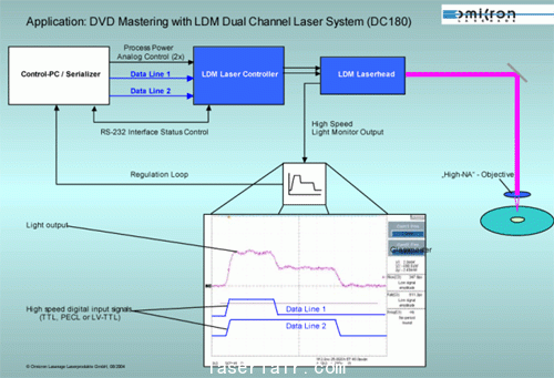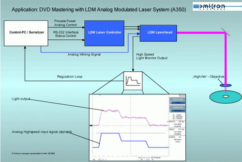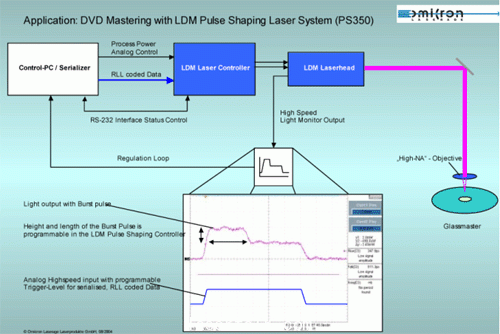 DVD 刻寫需要的是最高質(zhì)量的藍(lán)紫光半導(dǎo)體激光器。 光束質(zhì)量越高,波前誤差就越小,聚焦能力才可能達(dá)到所需的250nm或者更小。 DVD刻寫即激光對光盤表面的感光材料或者光致抗蝕材料進(jìn)行曝光。Omicron已經(jīng)研發(fā)出了一整套的LDM激光二極管用于這個應(yīng)用??刂破餍吞枮?A350, PS350 and DC180 的激光都可以用于CD/DVD mastering。其最高功率超過100mW,模擬或數(shù)字調(diào)制能力可達(dá)350 MHz/500MHz。 | ||||||||||||||||