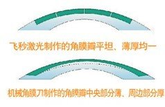 ①用飛秒激光制作的角膜瓣不會出現(xiàn)紐扣瓣、游離、破碎等情況,角膜瓣厚度各處相同,均勻一致;而微型角膜刀制作的角膜瓣一般都存在周邊部稍厚,中央部較薄的情況,很難做到中央部與周邊部厚度一樣的板層角膜瓣,因此角膜刀切瓣的術(shù)后復(fù)位固著性不好。