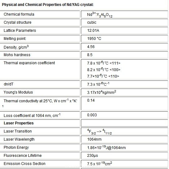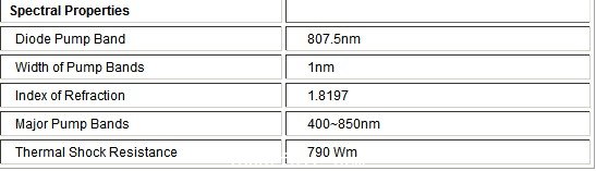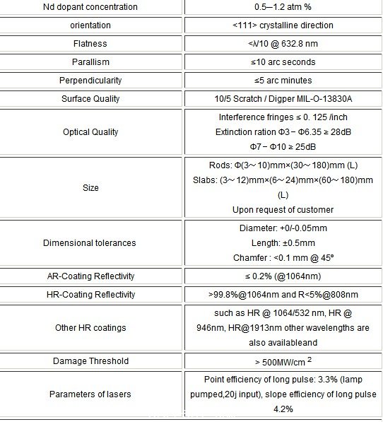 Main advantages: ² High Gain, High Efficiency, Low Threshold ² High Optical Quality and low Loss at 1064 nm ² Good Mechanical and Thermal Properties ² Easy to operate with TEM00 mode (Q-Switch, pulsed, CW) BJP’standard basic specificationns of Nd:YAG: