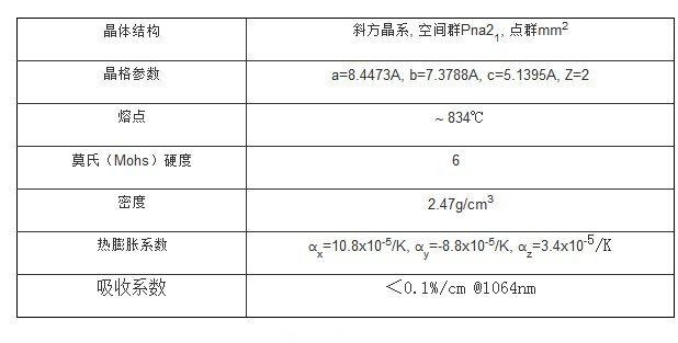 u對(duì)2W鎖模鈦寶石激光(<2ps, 82MHz)倍頻可輸出功率大于480mW的395nm波長激光,利用5x3x8 mm3 尺寸的LBO晶體可獲得的波長范圍在700-900nm。 u使用9mm LBO晶體的泵浦Nd:YLF激光(>500μJ @1047nm,<7ns, 0-10KHz)倍頻轉(zhuǎn)換率大于40%。 u利用LBO晶體和頻效應(yīng)可獲得187.7nm波長的真空紫外光。 u對(duì)調(diào)Q Nd:YAG激光進(jìn)行腔內(nèi)三倍頻可獲得輸出脈沖能量2mJ的衍射極限光束。 LBO晶體的物化特性: