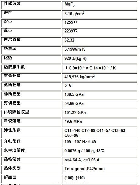 MgF2單晶廣泛應(yīng)用于激光、紅外、紫外光學(xué)、高能探測等科技領(lǐng)域. 廣泛應(yīng)用于紫外光電倍增管,準(zhǔn)分子激光器及可見紅外光學(xué)系統(tǒng)中。 產(chǎn)品介紹 單晶的性能參數(shù):