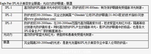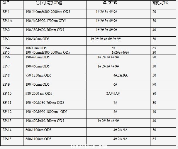 Eagle Pair寬光譜連續(xù)吸收式激光防護鏡技術參數(shù)及鏡架樣式表