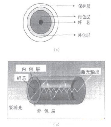 圖1是雙包層光纖截面結(jié)構(gòu)及其工作原理圖。從圖1(a)雙包層光纖的截面結(jié)構(gòu)町見,光纖包括四個部分:纖芯、內(nèi)包層、外包層、保護層。用分別表示雙包層光纖的纖芯、內(nèi)包層、外包層和保護層的折射率,則折射率應(yīng)滿足:。