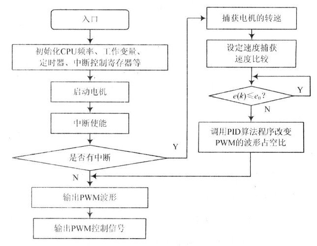 PWM信號(hào)的寬度由時(shí)間管理器中定時(shí)器的周期寄存器和與該定時(shí)器相關(guān)的比較寄存器決定,經(jīng)過(guò)PID處理后的控制器輸出u(k)為脈沖的占空比,然后寫(xiě)入選定定時(shí)器的比較寄存器,比較寄存器與周期寄存器的比值即為PWM波形的占空比,從而實(shí)現(xiàn)電機(jī)轉(zhuǎn)速的控制。#p#分頁(yè)標(biāo)題#e#