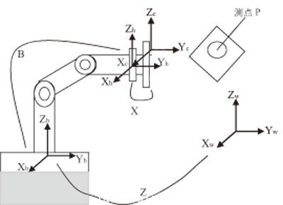 式中:PC為被測點P在視覺傳感器測量坐標(biāo)系下的坐標(biāo)值;X為機器人手眼關(guān)系,即機器人末端關(guān)節(jié)坐標(biāo)系與視覺傳感器測量坐標(biāo)系之間的變換關(guān)系;B為機器人末端關(guān)節(jié)坐標(biāo)系與機器人基坐標(biāo)系之間的坐標(biāo)變換關(guān)系;Z為機器人基坐標(biāo)系與白車身坐標(biāo)系之間的位置變換關(guān)系。
