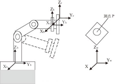 如圖4所示,機器人激光檢測系統(tǒng)中存在4個坐標(biāo)系。其中包括,與機器人相關(guān)的2個坐標(biāo)系,安裝機器人時確定的基坐標(biāo)系統(tǒng)Ob-XbYbZb和機器人末端關(guān)節(jié)坐標(biāo)系Oh-XhYhZh,還有車身坐標(biāo)系Ow-XwYwZw和視覺傳感器測量坐標(biāo)系Oc-XcYcZc。測量的結(jié)果即為測點P在車身坐標(biāo)Ow-XwYwZw下的坐標(biāo)PW。從圖4可以看出