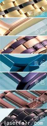 - 包括IP紫色、IP藍(lán)色、IP棕色、IP白等顏色。 依PVD工藝原理可鍍制成紫色、藍(lán)色、棕色、白色等,顏色深淺可依客戶色辦進(jìn)一步調(diào)試,其色彩絢麗,時(shí)尚標(biāo)志。