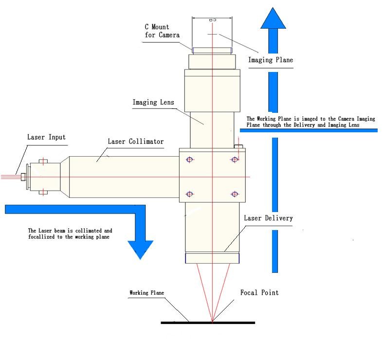 激光從入射端入射后,由準(zhǔn)直鏡組準(zhǔn)直,然后經(jīng)聚焦鏡組聚焦至工作平面。工作平面通過聚焦鏡組與成像鏡組成像到成像面,并由相機接收。產(chǎn)品結(jié)構(gòu)緊湊,穩(wěn)定性高。