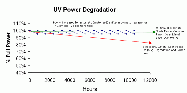 功率隨時間變化保持恒定 – 隨著工作時間推移,三倍頻(倍頻)晶體逐漸在出光過程中退化,最后導致紫外光功率下降。AVIA 使用一塊大體積多點位置設計的三倍頻晶體和晶體換位器來解決這個問題,通過自動移動THG晶體,輸出功率恢復到出廠水平。所有的AVIA激光器都提供一個至少75個點位THG晶體,與其它同類的只具有一個點位的產品相比優(yōu)勢不言而喻。如下圖所示,紫外線功率恢復到最初出廠時的指標。