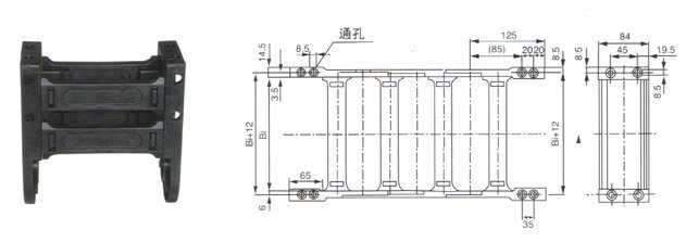 特點:耐磨、耐高溫、不變形、低噪音、裝拆靈活、壽命特長。 TP62系列 型號 內(nèi)腔(高X寬) 外腔(高X寬) 彎曲半徑(R) 節(jié)距 不支撐長度(M) 型式 62.75 62x75 83x112...