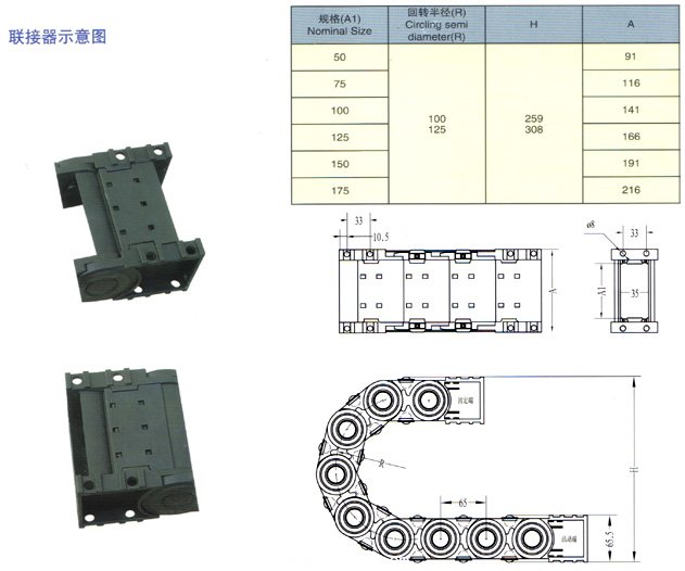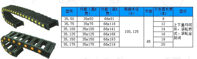 承重型工程塑料拖鏈系列 TZ35系列 型號 內(nèi)腔(高X寬) 外腔(高X寬) 彎曲半徑(R) 節(jié)距 不支撐長度(M) 型式 35.50 35x50 66x91 100.125 65 8 上下蓋均可開,滾輪橋...