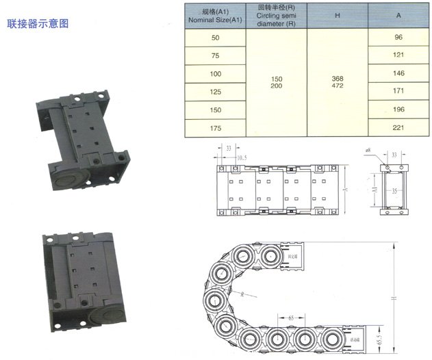 型號 內(nèi)腔(高X寬) 外腔(高X寬) 彎曲半徑(R) 節(jié)距 不支撐長度(M) 型式 45.50 45x50 79x96 150.200 78 10 上下蓋均可開,滾輪橋式、滾輪全封閉 45.75 45x75 79x12...