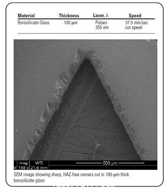 對于100μm厚的Shott D-263玻璃,切割速度可高達(dá)到40mm/s。采用短脈沖激光工藝使得玻璃薄片上面在不微裂紋產(chǎn)生的前提下,切割較為尖銳的角度成為了現(xiàn)實(shí)。