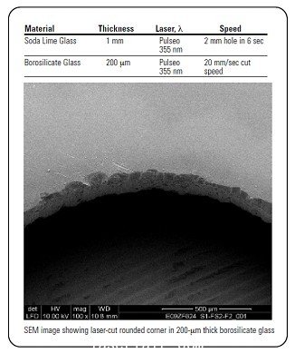 Spectra-Physics 的工業(yè)激光應(yīng)用實(shí)驗(yàn)室專門針對玻璃切割應(yīng)用開發(fā)了新工藝,可切割1mm厚的鈉鈣玻璃以及100-200μm厚度的Schott D-263硼硅酸鹽玻璃等。高速鉆切工藝在1mm厚玻璃上切割Φ2mm的圓孔僅用時(shí)6秒。對于較薄的硼硅酸鹽玻璃,直線及曲線的平均切割速度可達(dá)20mm/s。