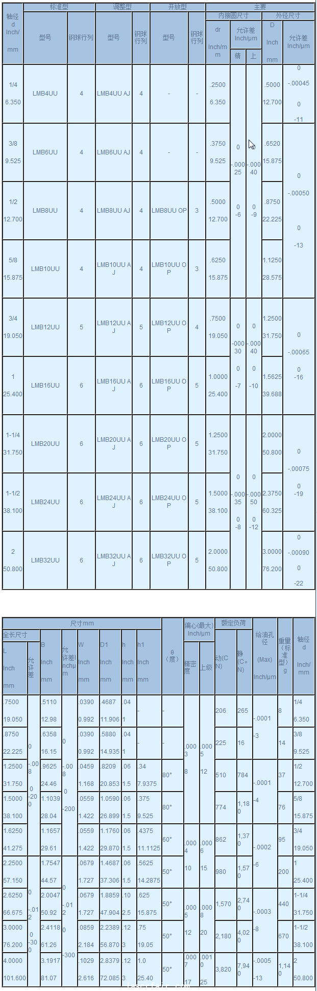 LMB英制系列 LMB英制直線軸承系列 軸徑 d Inch/ mm 標(biāo)準(zhǔn)型 調(diào)整型 開放型 主要 型號 鋼球行列 型號 鋼球行列 型號 鋼球行列 內(nèi)接圓尺寸 外徑尺寸 dr Inch/mm 允許差 Inc...