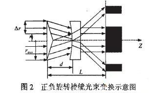 當(dāng)正負(fù)旋轉(zhuǎn)棱鏡及球面透鏡相結(jié)合,可實(shí)現(xiàn)多種光束的變換。如圖2所示,采用正錐棱鏡在前,負(fù)錐棱鏡在后的組合方式。該組合系統(tǒng)中兩正負(fù)棱鏡具有相同的錐角和折射率。在理論上具有嚴(yán)格的耦合特性。一束經(jīng)過準(zhǔn)直系統(tǒng)后的激光束入射到正錐棱鏡,光束發(fā)生偏折,而后經(jīng)過與正錐透鏡距離為的負(fù)錐棱鏡,其出射光束的形狀和能量分布隨著d的變化而發(fā)生變化。