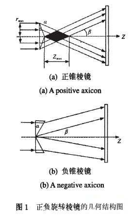 旋轉(zhuǎn)棱鏡最早由Mcleod提出,具有與普通球面透鏡不同的聚焦特性。圖1示出正負(fù)旋轉(zhuǎn)棱鏡的幾何結(jié)構(gòu)。