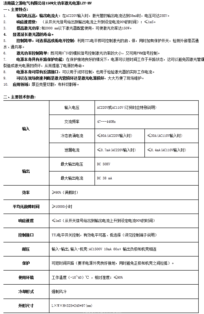 濟(jì)南鐳之源電氣有限公司150W大功率激光電源LZY-HV 一、主要特點(diǎn): 1. 輸出電壓高,輸出電流大 :在AC220V輸入時,激光管的輸出電流達(dá)到38mA時,電壓可達(dá)25KV。 2. 響應(yīng)...