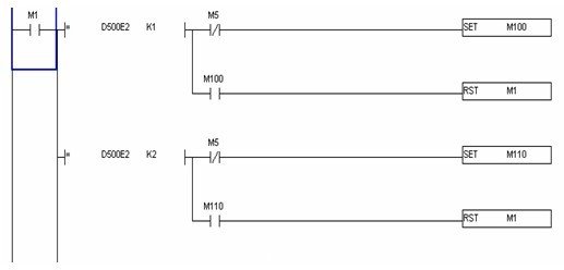 M11對應人機界面上按鍵取物氣動,當按下按鍵后將按鍵對應的數(shù)值存儲在PLC,D500開始的區(qū)間內(nèi),使用E1做地址修飾。然后將E1自增1,復位M11,表示一個動作已經(jīng)存儲完畢。用戶只需要按安照工藝順序依次按下按鍵即可將動作順序存入PLC,根據(jù)PLC中存儲的順序調(diào)用子程序。 當自動運行開始M1標志有效,E2是自動程序順序指針初始值是1代表程序執(zhí)行用戶所輸入的第一個動作,每執(zhí)行一個動作E2自增一也就是D500E2地址偏移一個位置。M100為調(diào)用子程序標志。每一個動作就是一個子程序。 2、程序修改方法 當按下清除一步M2636標志位有效,將指針計數(shù)E1自減1(即將D500E1地址倒退一步)并且將當前步的按鍵數(shù)值清除,并且復位M2636。程序也提供程序全部清除功能,如果需要也可以增加插入或修改某一條功能。 3、提供用戶所編寫工藝程序顯示畫面,在編寫程序時候用戶可以隨時檢查輸入是否正確。具體實現(xiàn)方法如下: