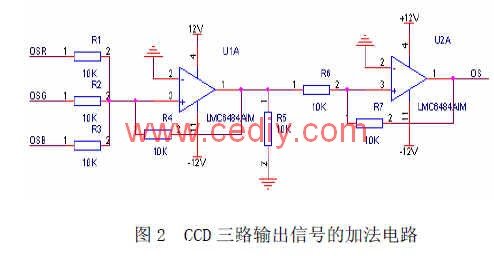 LabVIEW 對 NI的數(shù)據(jù)采集卡提供了驅(qū)動程序,通過在 MAX中創(chuàng)建采集任務(wù)及相應(yīng)參數(shù),并調(diào)用DAQ 函數(shù)就可直接采集CCD的輸出信號 [4]。TCD2252按照彩色三分量RGB進(jìn)行三路輸出,單獨采集一路或兩路信號時,會造成某些顏色的光譜信號漏采樣,故設(shè)計了對R、G、B三路信號同時采集??紤]到用軟件實現(xiàn)時對采集卡采樣率的要求較高,故在采集前先通過加法電路對三路電壓信號值相加(見圖2),進(jìn)而實現(xiàn) RGB三路光強信號的同時采集。