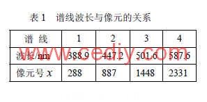 首先對譜線在 CCD上的對應(yīng)像元位置進(jìn)行標(biāo)定。實驗中選擇氦燈的 4條特征譜線分別為 388.9nm、447.2nm、501.6nm、587.6nm,先采集數(shù)據(jù)得到各譜線峰值在 CCD上對應(yīng)的像元位置如表 1所示。