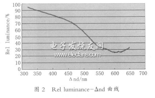 采用本試驗總結(jié)出的以上Rel luminance- Δnd曲線,對于某一未知光程差的VA 液晶顯示器,只需簡單測試出高壓光電曲線,得出高壓顯示亮度與最大值顯示亮度的比值,然后對照圖2 所示的曲線,就可準(zhǔn)確得出相應(yīng)的光程差值。
