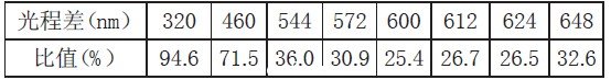 由圖1 可總結(jié)出,在有效光程差較小時,可見光的各波長比較聚集,顏色只有黑白兩色。在有效光程差300nm 附近出現(xiàn)一亮態(tài)極大值,之后隨著有效光程差的增大,不同波長的相位差差別越大,其亮態(tài)峰值將越來越小。