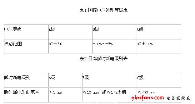 工業(yè)現(xiàn)場(chǎng)的供電品質(zhì)很差,常常不能達(dá)到國家對(duì)電網(wǎng)波動(dòng)等級(jí)中規(guī)定的最低標(biāo)準(zhǔn)C級(jí)。表1列出了國家標(biāo)準(zhǔn)對(duì)電網(wǎng)波動(dòng)等級(jí)的規(guī)定。當(dāng)供電電壓超過C 級(jí)規(guī)定時(shí),通常稱為過壓或者欠壓。而失壓又稱瞬時(shí)斷電。產(chǎn)生瞬時(shí)斷電,最常見的原因是用電設(shè)備突然短路而它的保險(xiǎn)絲還沒有熔斷的瞬間。另外開關(guān)或刀閘觸點(diǎn)接觸不良或顫抖等也會(huì)產(chǎn)生瞬間斷電。瞬間斷電所允許時(shí)間國內(nèi)尚無標(biāo)準(zhǔn),表2列出了日本《工業(yè)用計(jì)算機(jī)環(huán)境標(biāo)準(zhǔn)》中規(guī)定的瞬間斷電級(jí)別。