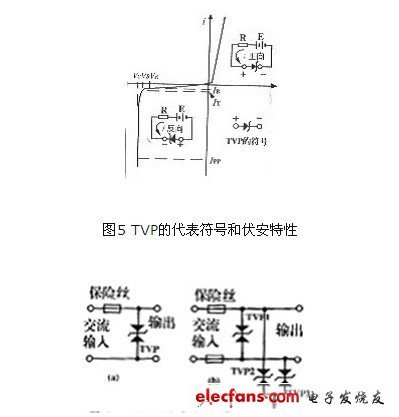 直流電源輸出過電壓故障較少,但過電壓具有破壞性。最有效的過壓保護(hù)措施是使用2.3節(jié)的TVP瞬態(tài)電壓抑制器件。它不但可以吸收電源因雷擊或者干擾造成的過電壓尖峰脈沖,而且對(duì)電源出現(xiàn)過壓故障也有很好的保護(hù)。圖9是使用TVP管構(gòu)成的電源過壓保護(hù)電路。當(dāng)電源發(fā)生過壓故障時(shí),TVP管被擊穿而將電壓箝位于TVP管的VC以內(nèi),從而保護(hù)了控制裝置。 只是當(dāng)電壓持續(xù)過壓時(shí)燒毀保險(xiǎn)絲,而抑制電源線上的尖峰干擾通常不會(huì)燒毀保險(xiǎn)絲,也不干擾計(jì)算機(jī)正常運(yùn)行。