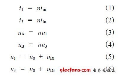 當(dāng)二極管的管壓降uD1 與uD3 不等時(shí),由公式(3) 、(4) 、(5) 、(6) 可以得出,兩個(gè)變壓器原邊的電壓uA與uB 也不等,二極管管壓降高的變壓器原邊的電壓就高,反之亦然。由公式(1) 、(2) 得: