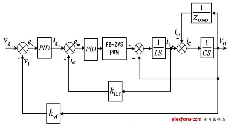 由于在本電源中使用的開關(guān)元件的過載承受能力有限,必須對(duì)輸出電流進(jìn)行限制,因此,控制電路采用電壓電流雙環(huán)結(jié)構(gòu)(內(nèi)環(huán)為電流環(huán),外環(huán)為電壓環(huán)) ,調(diào)節(jié)器均為PID.圖8 為控制電路的原理框圖。加入電流內(nèi)環(huán)后,不僅可以對(duì)輸出電流加以限制,并且可以提高輸出的動(dòng)態(tài)響應(yīng),有利于減小輸出電壓的紋波。