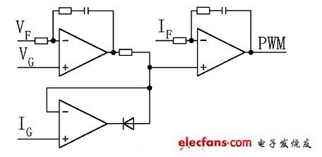 在實(shí)際的控制電路中采用了穩(wěn)壓、穩(wěn)流自動(dòng)轉(zhuǎn)換方式。圖9 為穩(wěn)壓穩(wěn)流自動(dòng)轉(zhuǎn)換電路。其工作原理是:穩(wěn)流工作時(shí),電壓環(huán)飽和,電壓環(huán)輸出大于電流給定,從而電壓環(huán)不起作用,只有電流環(huán)工作;在穩(wěn)壓工作時(shí),電壓環(huán)退飽和,電流給定大于電壓環(huán)的輸出,電流給定運(yùn)算放大器飽和,電流給定不起作用,電壓環(huán)及電流環(huán)同時(shí)工作,此時(shí)的控制器為雙環(huán)結(jié)構(gòu)。這種控制方式使得輸出電壓、輸出電流均限制在給定范圍內(nèi),具體的工作方式由給定電壓、給定電流及負(fù)載三者決定。