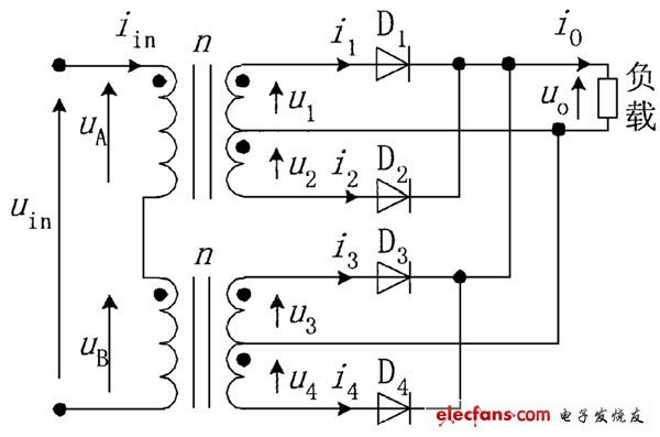 多個(gè)變壓器的這種連接方式,不僅可以使得輸出整流二極管實(shí)現(xiàn)自動(dòng)均流,還可以使得變壓器的設(shè)計(jì)模塊化,簡(jiǎn)化變壓器的制作工藝,降低了損耗。