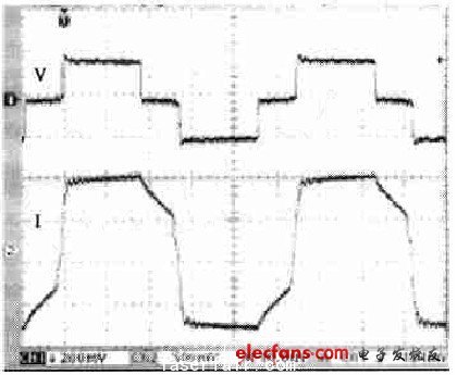 為了消除諧振及減小功率母排、濾波電容的溫升,我們最終采用了容性功率母排,圖4 為采用容性功率母排后滿功率時(shí)采集的變壓器初級(jí)的電壓、電流波形圖。從圖中可以看出,諧振基本消除,滿載運(yùn)行一小時(shí)后,無感功率母排的溫升為11 ℃,電容C5的溫升為10 ℃。