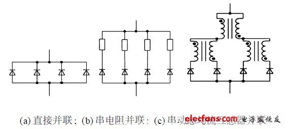 對(duì)于直接并聯(lián)方式,二極管的均流效果很差,輸出電流一般限制在幾十安培到幾百安培左右,不易于做到上千安培。在電流為上千安培輸出的情況下,為了達(dá)到均流的目的,可以采用串入電阻方式并聯(lián)或采用串入動(dòng)態(tài)均流互感器并聯(lián)。由于鄰近效應(yīng)及趨膚效應(yīng)的影響,對(duì)于串入電阻的并聯(lián)方式,二極管的均流效果隨輸出電流的大小而改變,均流效果較差。為達(dá)到較好均流效果,串入的電阻不宜太小,這又帶來較大的損耗。對(duì)于串入動(dòng)態(tài)均流互感器的并聯(lián)方式,可以達(dá)到較好的均流效果,但大電流互感器的制作工藝復(fù)雜,成本高,同時(shí)由于動(dòng)態(tài)均流互感器的漏感及引線電感的存在,使得二極管在關(guān)斷時(shí)的反向尖峰電壓增高,電磁干擾及損耗隨之增加。