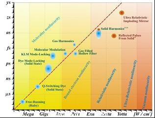 隨著激光技術(shù)飛速發(fā)展,超快激光出現(xiàn)了人們的視線之中,它具備獨(dú)特的超短脈沖、超強(qiáng)特性,能以較低的脈沖能量獲得極高的峰值光強(qiáng)。超短脈沖啁啾放大技術(shù)(Chirped Pulse Amplification,CPA)的出現(xiàn)使超快激光的強(qiáng)度得到大大提高。與傳統(tǒng)長脈沖激光及連續(xù)激光不同,超快激光有著超短的激光脈沖,這使得激光脈沖的頻譜寬度相當(dāng)大。這樣寬的頻譜在進(jìn)行諸如原子能級(jí)研究,激光選鍵化學(xué)等方面都具有重要的應(yīng)用。利用超快激光脈沖短的特點(diǎn),可以采用泵浦-探測(cè)的方式,將激光脈沖與物質(zhì)相互作用現(xiàn)象在不同的時(shí)刻照相,以期獲得整個(gè)過程的特點(diǎn)。這個(gè)方法已經(jīng)被應(yīng)用到各個(gè)領(lǐng)域,如在原子與分子反應(yīng)動(dòng)力學(xué)研究中以及觀察電子的運(yùn)動(dòng),利用飛秒激光脈沖甚至阿秒脈沖,通過泵浦-探測(cè)的方法觀察到反應(yīng)過程。聚焦后的超快激光,其峰值功率密度超過1013W/cm2時(shí),所產(chǎn)生的電場(chǎng)強(qiáng)度就已經(jīng)大于原子的內(nèi)電場(chǎng)。它提供的極強(qiáng)極高的電場(chǎng),能夠超過價(jià)帶電子的束縛力,使分子、原子的電子體系發(fā)生巨大變化。利用這個(gè)特性,人們可以研究由于超快激光導(dǎo)致原子內(nèi)部產(chǎn)生的奇特現(xiàn)象。并且,超快激光還顯示出其它不同的特性,如熱影響區(qū)域小、作用效果能夠超過光學(xué)衍射極限、優(yōu)秀的空間選擇特性。下圖展示了超快超強(qiáng)激光的發(fā)展過程與應(yīng)用范圍。