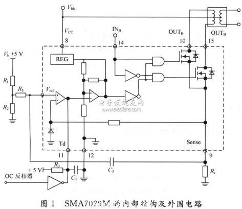 圖1也給出基于SMA7029M芯片組電機驅(qū)動設計的外圍電路,主要包含參考電壓取樣電路,OC門反向器輸入電路,電流取樣以及輸出變壓器耦合電路。通過設置電路中的R3=47 kΩ,C1=470 pF,可以得到脈寬約等于12μs。