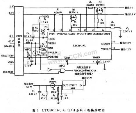 為了使板卡在熱插拔的過程中,不對CPCI總線產生沖擊,不影響CPCI總線上數(shù)據的傳輸,則需要一個良好的電源切換控制電路。這里選用LTC1643AL實現(xiàn)這一功能。LTC1643AL與CPCI總線的連接原理圖如圖3所示。