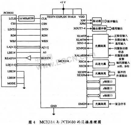 MCX314與PCI9030的連接原理圖如圖4所示。PCI9030具有可編程的片選信號,可通過配置片選基地址寄存器使得在某一局部地址范圍內產生片選信號,這樣就節(jié)省了譯碼電路,使得應用更加方便。通過對局部地址總線寄存器進行配置,將PCI9030的數(shù)據總線配置為16位,此時LBEI#就作為LAl來使用。