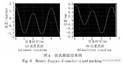對(duì)于高精度的激光直寫,衡量其性能主要取決于速度的穩(wěn)定、響應(yīng)度和位置的精確。因此在圖3的仿真中,要根據(jù)實(shí)際情況,多次調(diào)節(jié)控制系統(tǒng)參數(shù),并經(jīng)過分析和對(duì)比,從中得到一幅速度穩(wěn)定、位置精確的跟蹤圖,其仿真波形如圖4所示。