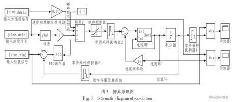 根據(jù)設(shè)計(jì)原理,圖l中的偏差計(jì)數(shù)模塊就等效為帶前饋補(bǔ)償?shù)腜ID控制器,并設(shè)計(jì)成圖2中所對(duì)應(yīng)的部分,并且將D/A轉(zhuǎn)換器等效設(shè)計(jì)成離散的數(shù)據(jù)通過零階保持器;將安川伺服驅(qū)動(dòng)器等效速度環(huán)和電流環(huán);輸出的信號(hào)采用仿真示波器進(jìn)行觀察。因此整個(gè)伺服三環(huán)PID仿真原理如圖3所示。